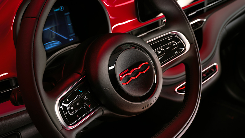 В интериора му ще намериш черни седалки от рециклиран плат с монограм FIAT и червени шевове. Освен това ще можеш да ги регулираш в 4 посоки. Специално рисувано лого с емблемата 500 обогатява първокласния черен волан, преоформен, за да припомни емблематичния стил на FIAT 500 с две спици от 1957.